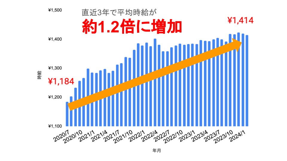 2020年7月から2024年2月の製造業求人平均時給をグラフ(株式会社コンフィデンス・インターワークス公開データより算出)です。見ていただくとわかる通り、年々時給が上がっています。製造業だから給与は諦めるという時代も変わってきているのかもしれません。