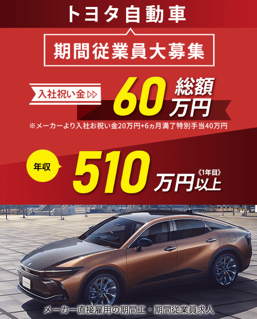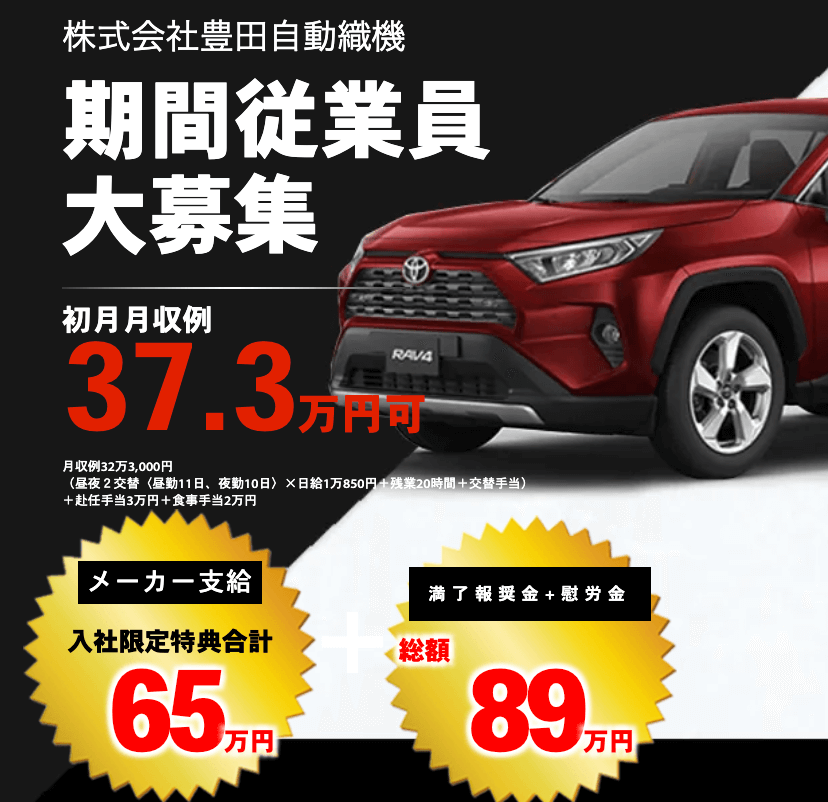 入社特典総額最大366万円!正社員雇用形態実績は1,000名以上!(*)世界のトヨタの正社員になることも可能