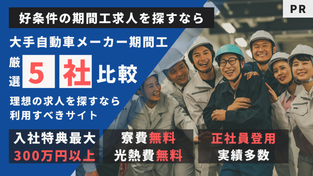 そのため期間工で求人を探している人に今回おすすめの大手自動車メーカーの求人をご紹介します。大手自動車メーカーだから待遇も良く入社特典が豊富で正社員登用制度もありおすすめです。